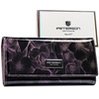 - Klasická, horizontálna, veľká peňaženka s prítlačou ušitá z prírodnej a ekologickej kože. Lakovaný model zdobený kvetinovým vzorom. Vybavená časťou na karty, doklady, ako aj hotovosť, vrátane vrecka na mince uzatváraného bigiel. Elegantná darčeková krabič