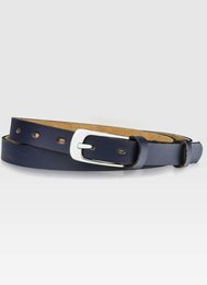 Dámsky úzky opasok z ekologickej kože v tmavomodrej farbe so zlatou prackou - Peterson